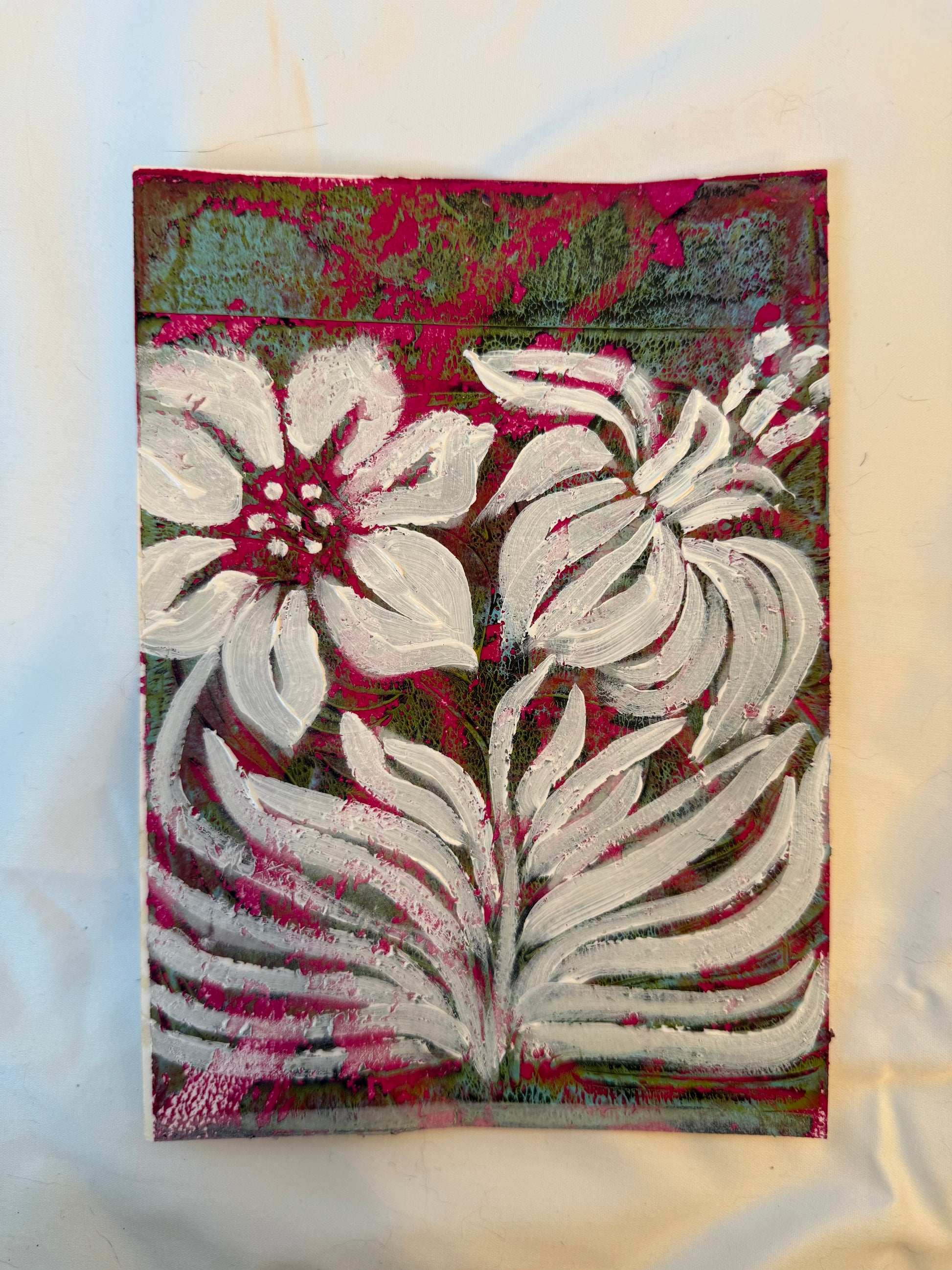 This is a lovely 5x7 original piece of artwork on heavy duty artist paper. It was created using collage, watercolor, and acrylic paint. It is ready to be matted, framed, and adorned on your wall. It is sure to warm up any space.