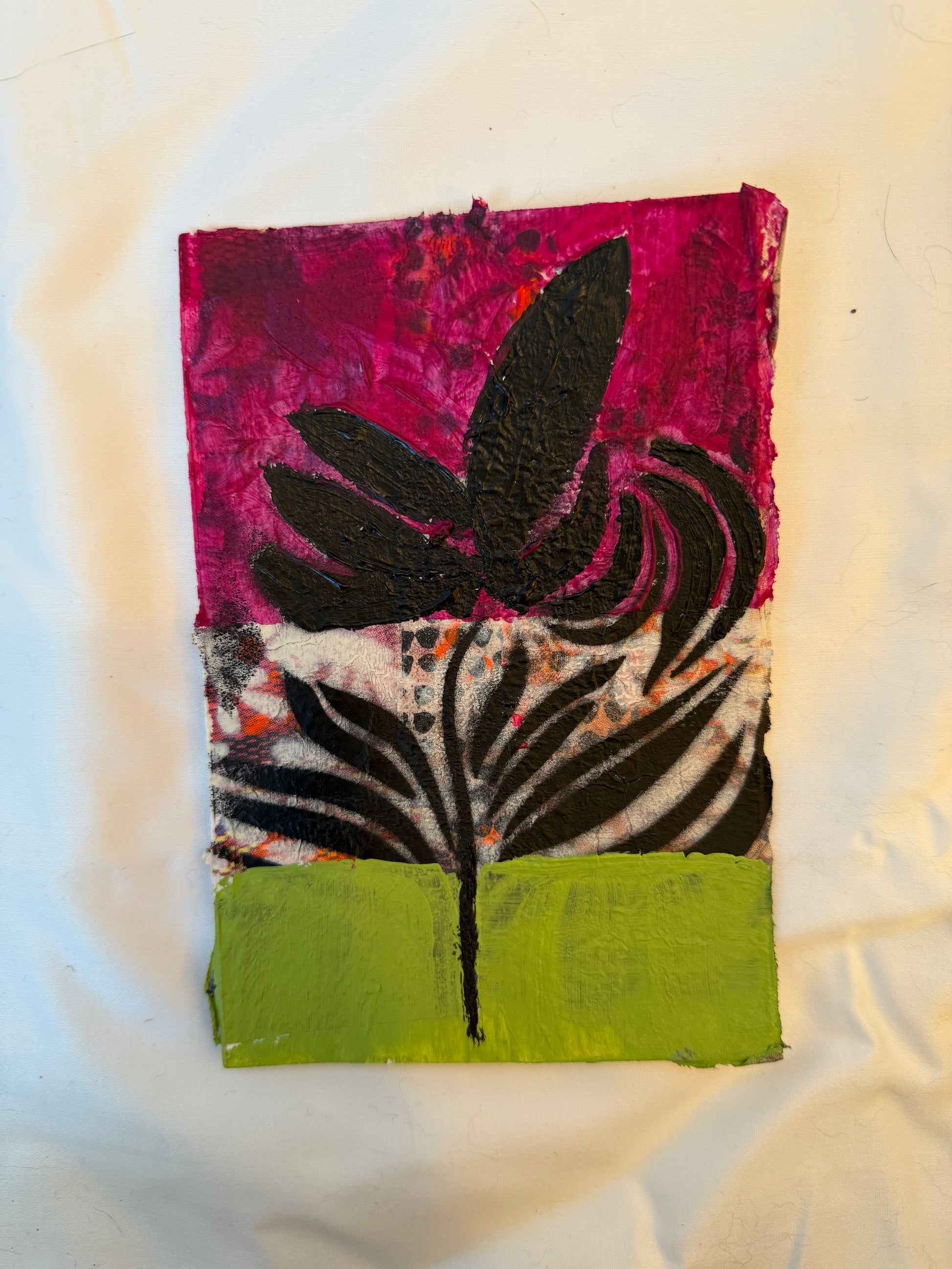 This is a lovely 5x7 original piece of artwork on heavy duty artist paper. It was created using collage, watercolor, and acrylic paint. It is ready to be matted, framed, and adorned on your wall. It is sure to warm up any space.