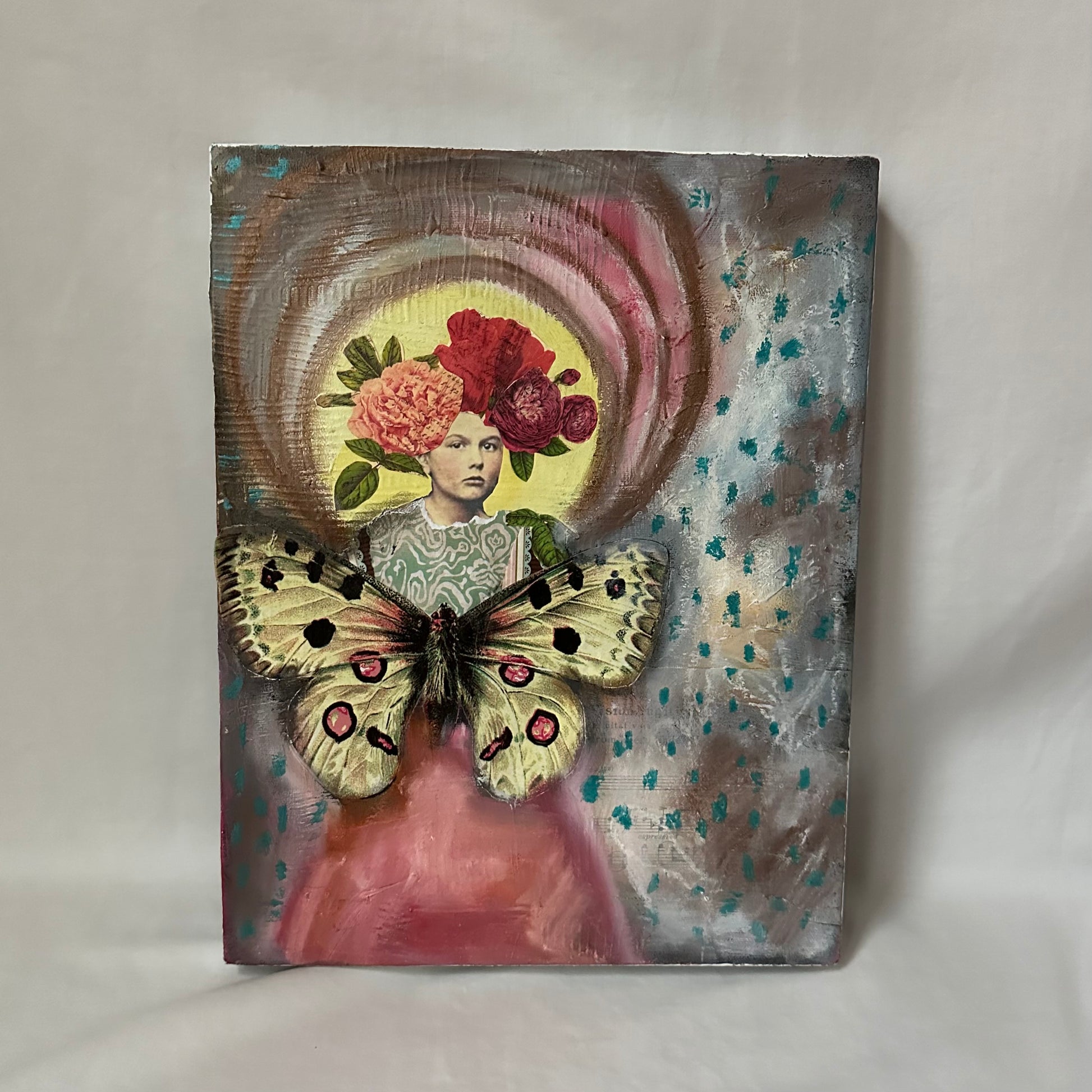 An original piece of artwork. This is a special mixed media piece created with collage ephemera, acrylics, and oil pastels. This artwork is on a wooden cradled board and measures 11x14 and 1 1/2" deep. The colors are soothing and she is ready to display and is sure to bring warmth to any room.