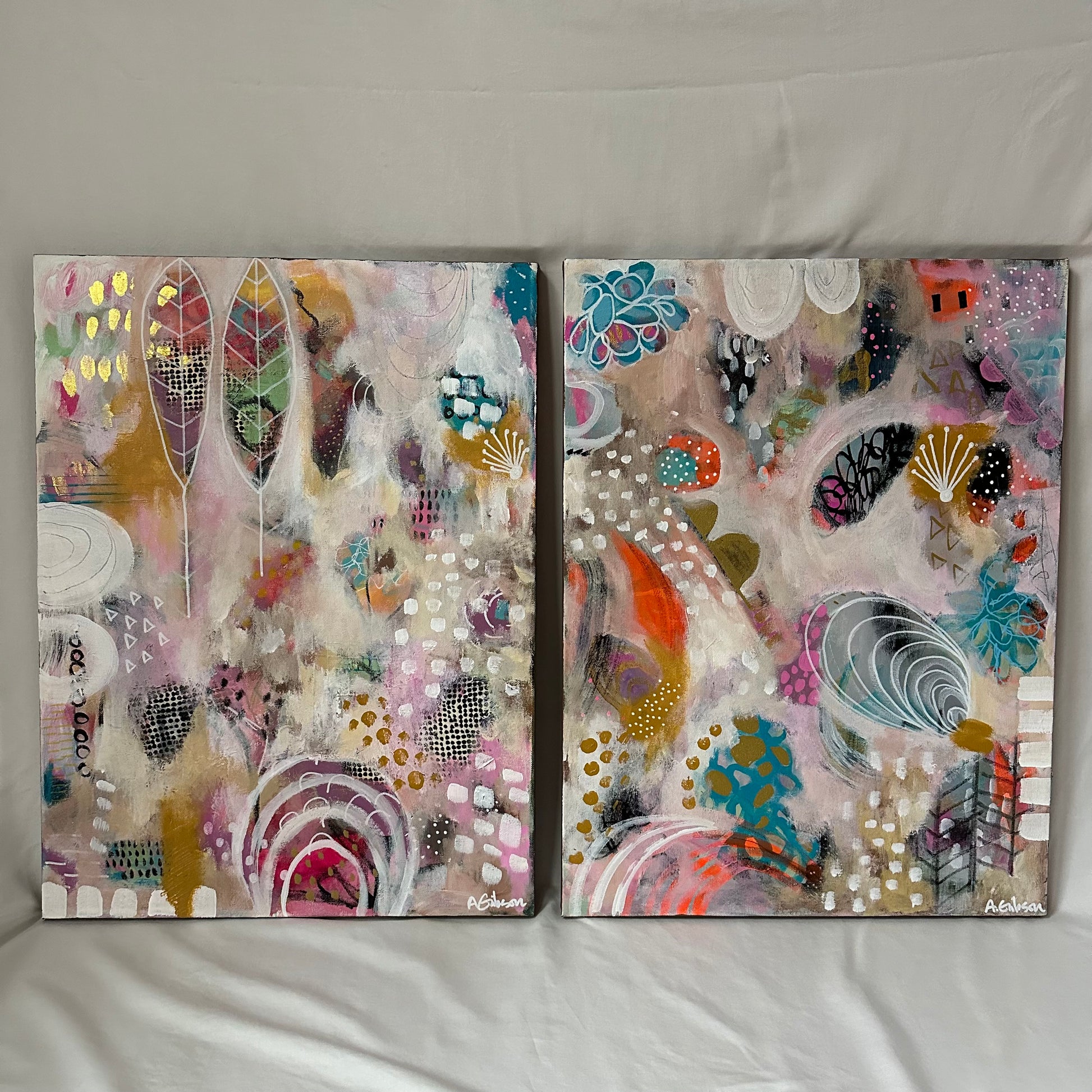 This is an abstract mixed media set of TWO canvases full of color and whimsical elements. I used colored pencils and acrylics, as well as homemade collage papers. This piece is varnished with high quality materials to protect the piece for a lifetime.