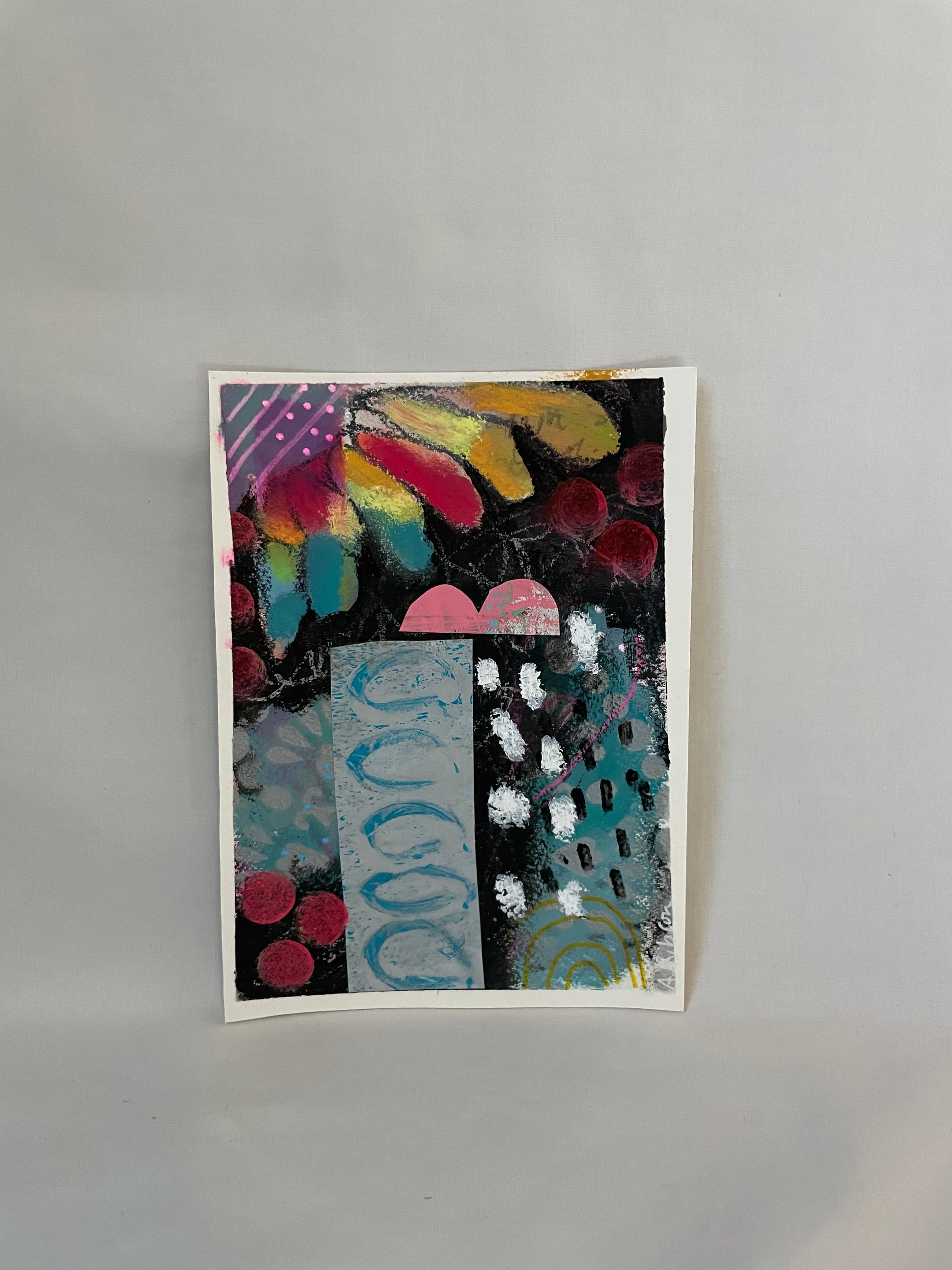 I used a colorful palette of blues and pinks with hints of gold, with an overlay of black to take advantage of the negative space. It measures at 5 x 7 inches and would look great matted in a frame.