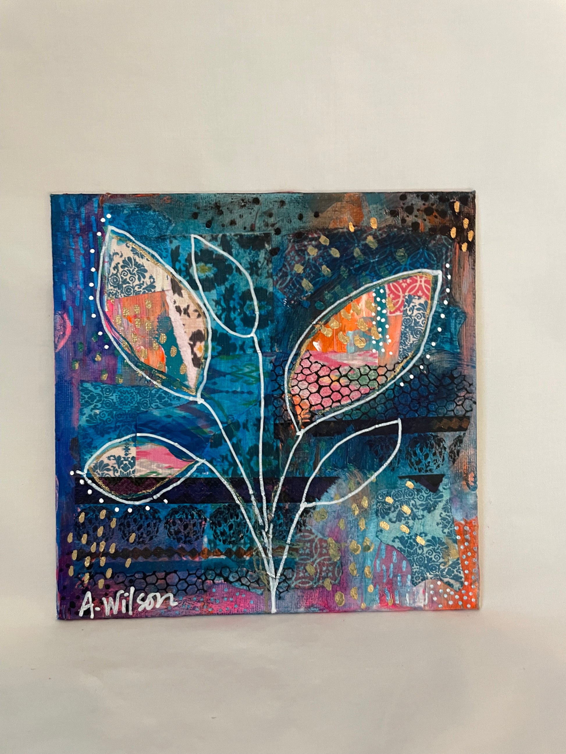 The color palette is bright blues, oranges, and pinks with collage elements peeking through. It measures at 8 x 8 inches and is on a hard artist canvas board. She would look fantastic matted and framed.