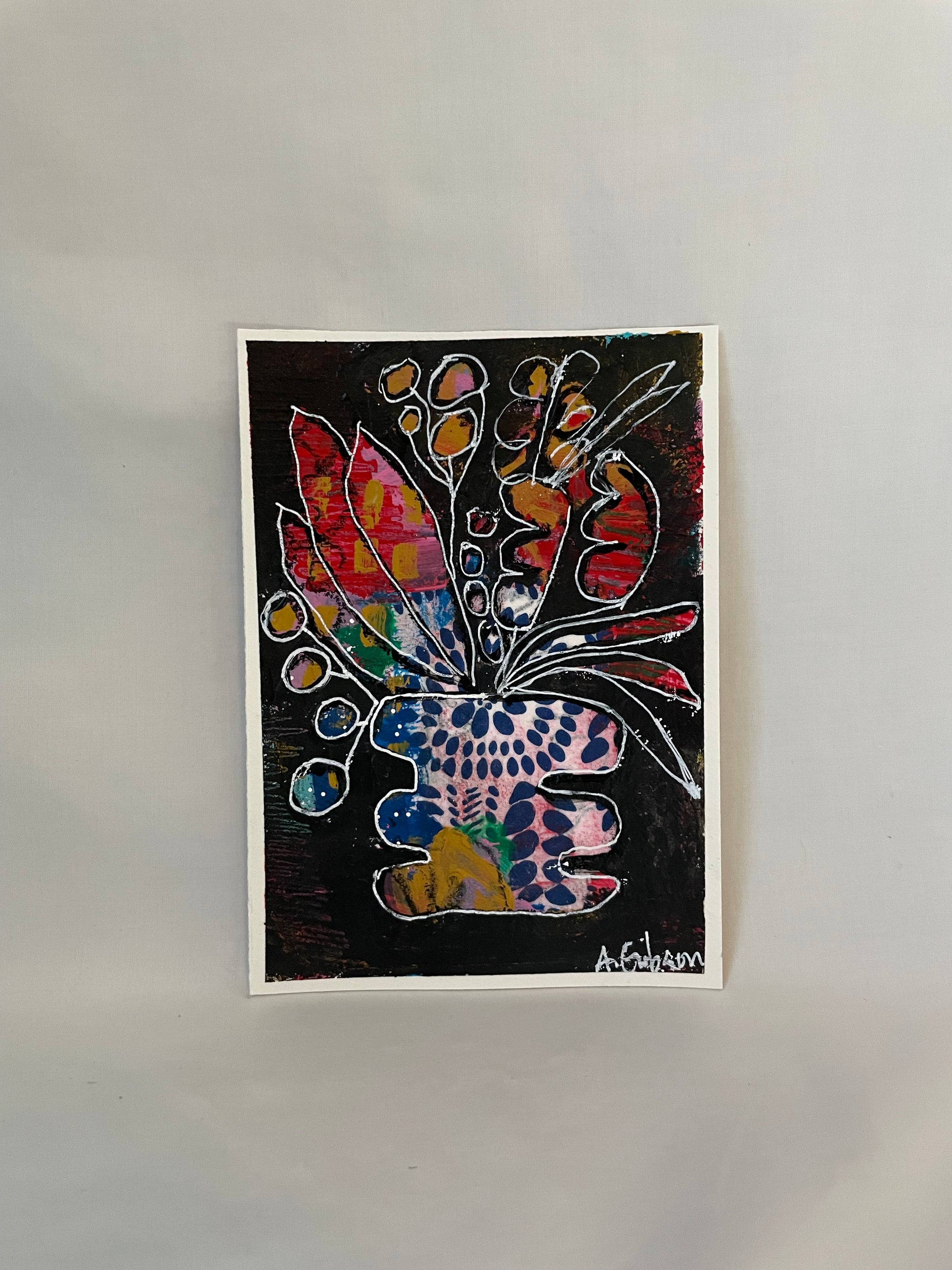 Abstract floral artwork. I used colored pencils and acrylics on the underpainting with oil pastels as the top layer. There are also pieces of collage peeking through the paint. This piece is varnished with high quality materials to protect the piece for a lifetime.