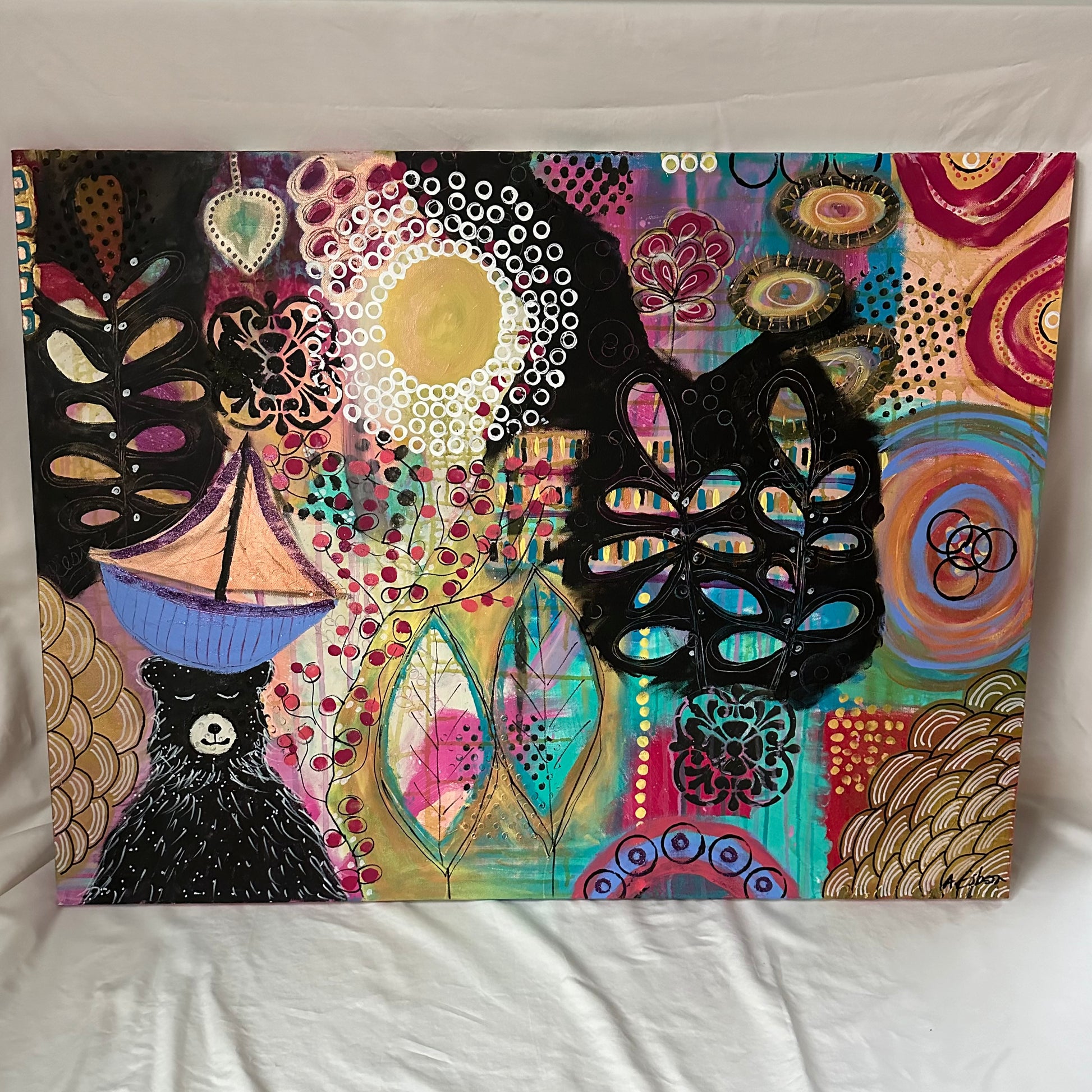 This very large piece of artwork is one of my all-time favorites and was so fun to create. It was created with acrylic paints and has hints of glitter throughout. This piece is varnished with high quality materials to protect the piece for a lifetime. The black bear with a whimsical ship perched on his head is an unexpected and perfectly adorable element.